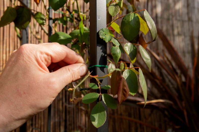 Fixez les tiges principales du rosier au support avec des liens en plastique souple ou en caoutchouc pour éviter d’abîmer la plante. Au fur et à mesure de sa croissance, continuez de fixer les nouvelles pousses. Pour obtenir une floraison abondante, dense et bien répartie, essayez d’étaler les branches horizontalement ou en éventail.