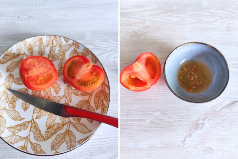 2- Avec une cuillère, récupérez les graines et la pulpe de la tomate et versez-les dans un pot.