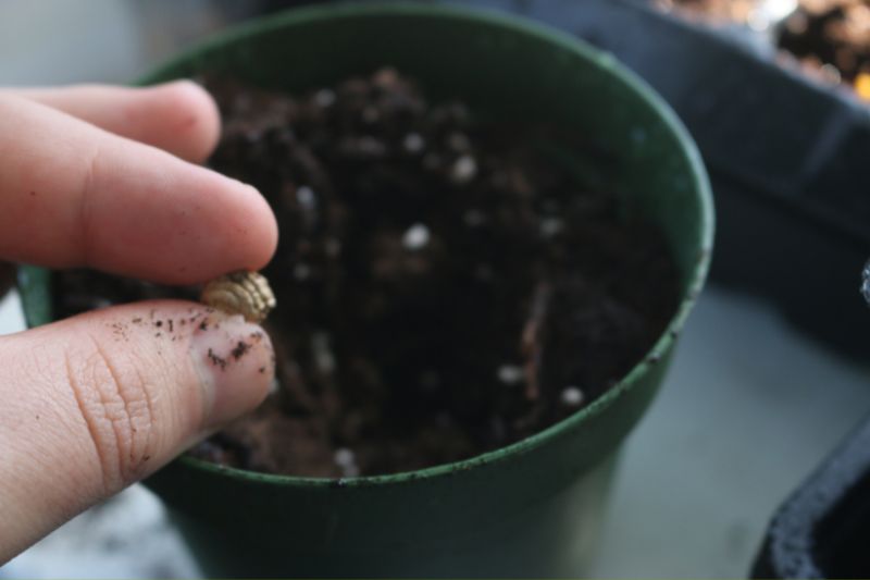- Placez 2 à 3 graines par contenant en les espaçant, puis enfoncez-les à environ 3 cm de profondeur avec l’index.