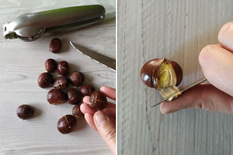 1/ Commencez par nettoyer les châtaignes dans de l'eau et enlevez celles qui flottent en surface. Puis, à l’aide d’un couteau ou d’une pince à châtaignes, faites une incision dans la coquille dur du fruit. Enlevez ensuite cette première peau de vos châtaignes.