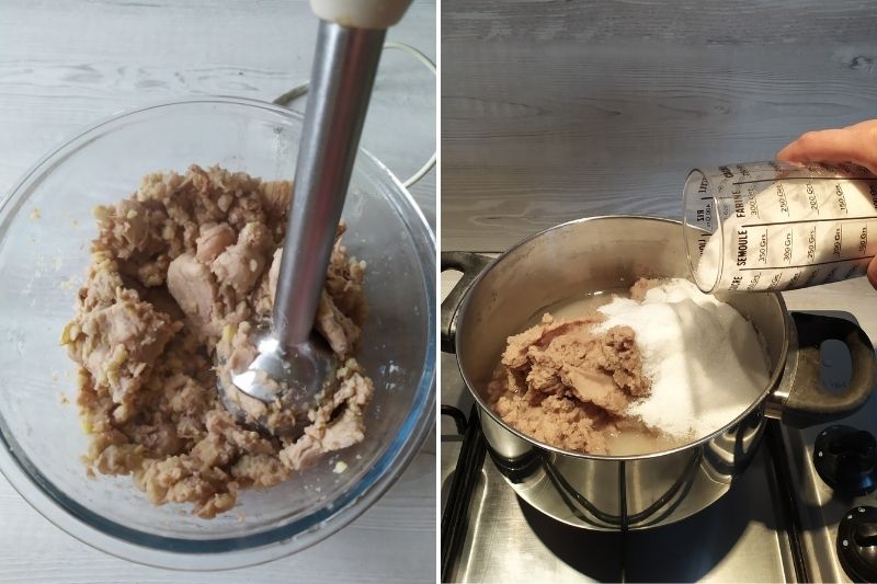 5/ Verser la purée dans une marmite ou dans un confiturier. Ajoutez un verre d’eau, ainsi que le sucre et la gousse de vanille fendue en deux