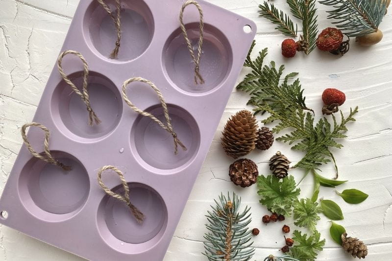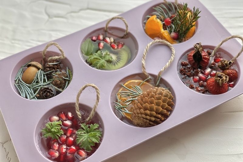 - Versez dans chaque moule vos fruits, graines, feuilles et autres décorations ;