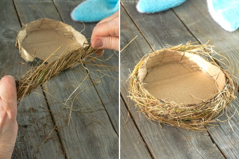 - Vous pouvez créer aussi un nid en prenant du foin que vous entortillerez. Collez-la ensuite contre un gabarit en carton comme ici ou sur une boite à camembert. C'est simple et facile à réaliser !
