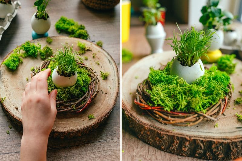 - Si votre enfant est très jeune ou que vous ne souhaitez pas faire une couronne, vous pouvez simplement apporter des petites touches de décorations autour des œufs. Par exemple, placez un peu de mousse verte, des fleurs séchées ou quelques plumes. Votre enfant peut aussi peindre ou décorer les coquilles. Et pourquoi pas simplement posé dans un coquetier ?