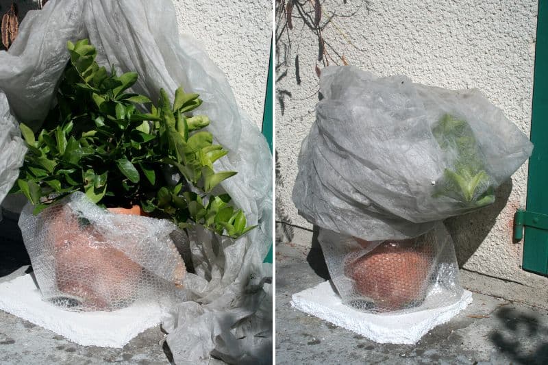 4- Emballez les parties aériennes, voire également le tronc, avec un voile d’hivernage, en prenant soin de ne pas casser les rameaux.