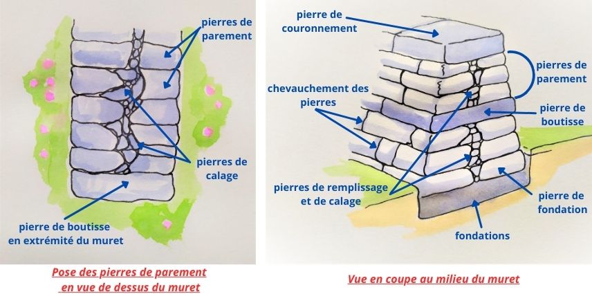 - Attention à ne pas mettre de pierre de calage sur les bords ou en fin de muret ! En effet, celles-ci pourraient bouger dans le temps.