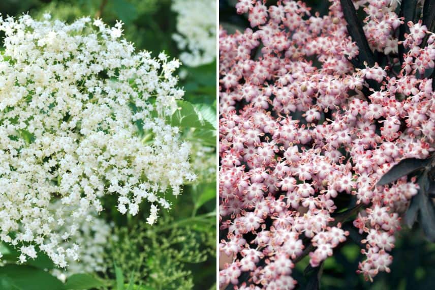 Les fleurs du sureau noir commun sont blanches. En revanche, certaines variétés horticoles offrent des fleurs roses :