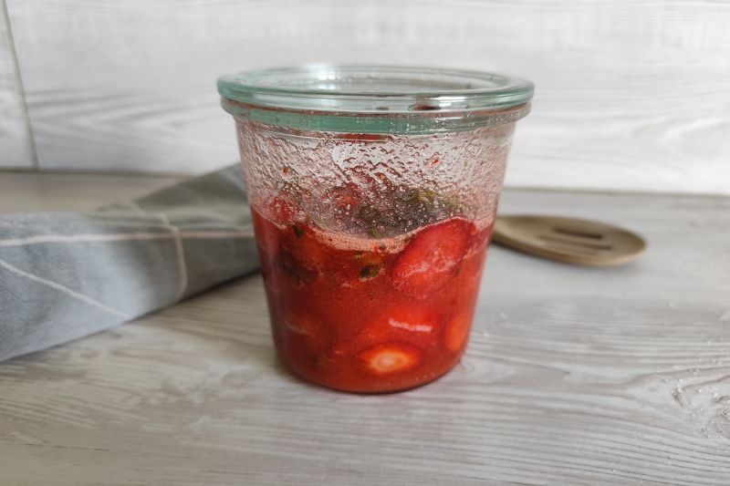 4- Refermez le bocal, mais sans mettre de joint, afin que les gaz de la fermentation puissent s'échapper. À défaut, vous pouvez couvrir votre bocal à confiture avec un tissu ou une gaze maintenue par un élastique. Placez le bocal à température ambiante (18 à 22 °C), à l’abri de la lumière directe.