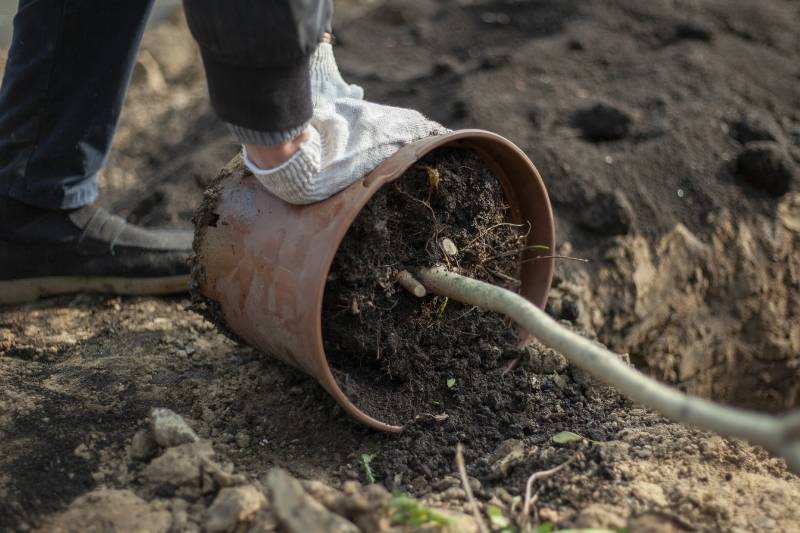 - Une motte légèrement humide, voire sèche prends moins de volume et se dépote donc plus facilement qu'une motte détrempée. Le poids de la terre sera également moins lourd et vous préserverez ainsi votre dos, surtout avec de grands arbustes ou sujets.