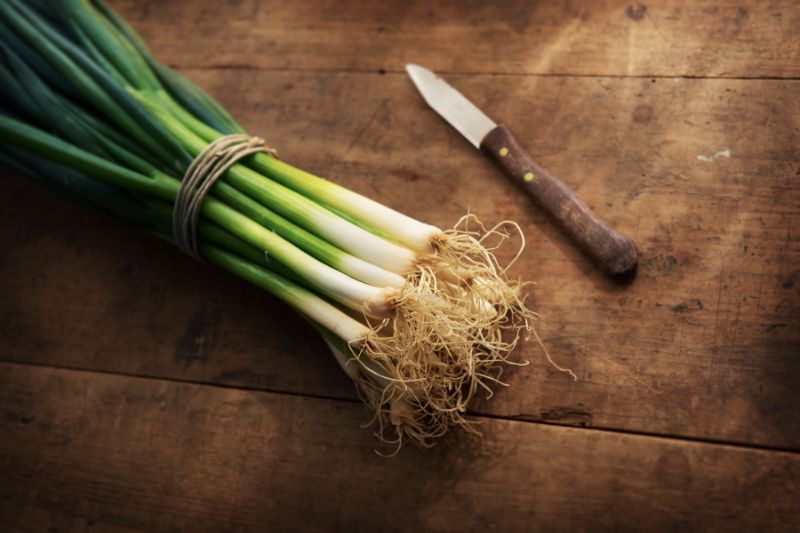 Les feuilles (les "tiges" sortant du bulbe) des oignons verts ont un goût plus doux et moins piquant que les oignons ordinaires, et sont souvent utilisées dans les salades, les sautés, les soupes et autres plats pour ajouter de la saveur et de la couleur. Les oignons verts sont par ailleurs une bonne source de vitamines et de minéraux, y compris la vitamine C, la vitamine K et le potassium.