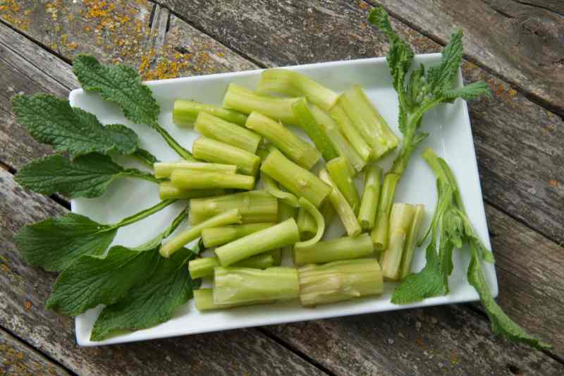 • Rincez les herbes, puis coupez grossièrement les tiges en petits tronçons et les feuilles. On peut peler la partie pelucheuse des tiges, mais ceci n'est pas indispensable.