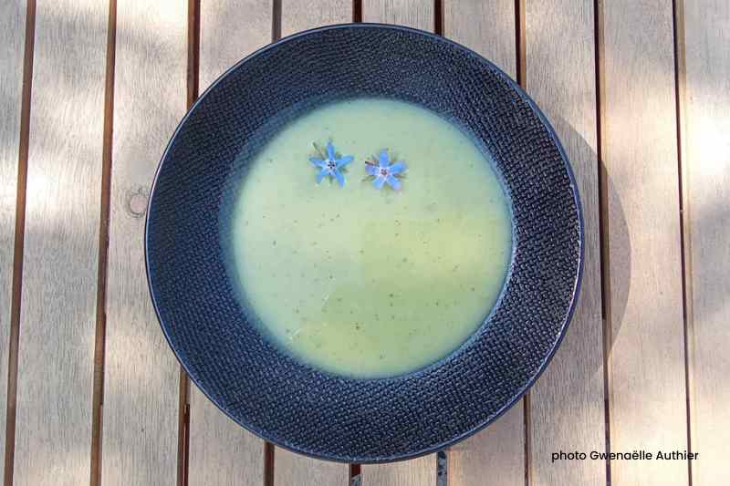 Dans la grande famille des soupes vertes, la bourrache rajoute une note rafraichissante. Si on ne peut pas l'utiliser seule, car la soupe aurait un goût trop prononcé, il est intéressant de la mélanger.
