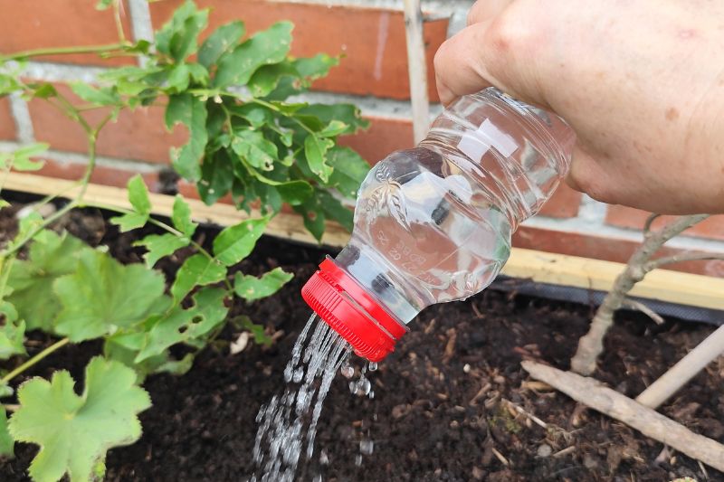 Remplissez la bouteille d'eau (de préférence de pluie), puis revissez le bouchon percé. Vérifiez que tous les trous sont bien percés et qu'ils permettent un bon débit d'eau. Renouvelez le perçage si besoin. Votre arrosoir zéro déchet est maintenant prêt à l’emploi.