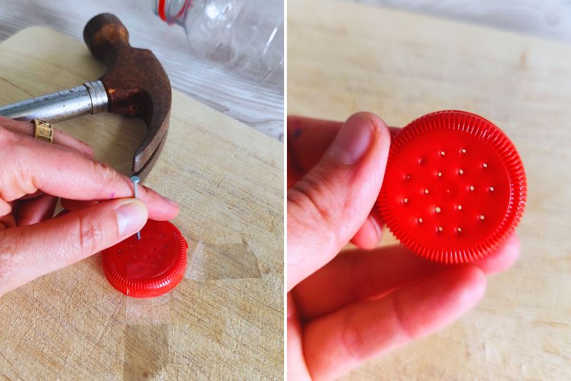Avec votre marteau, percez le bouchon de la bouteille avec le clou, à intervalles régulier.
