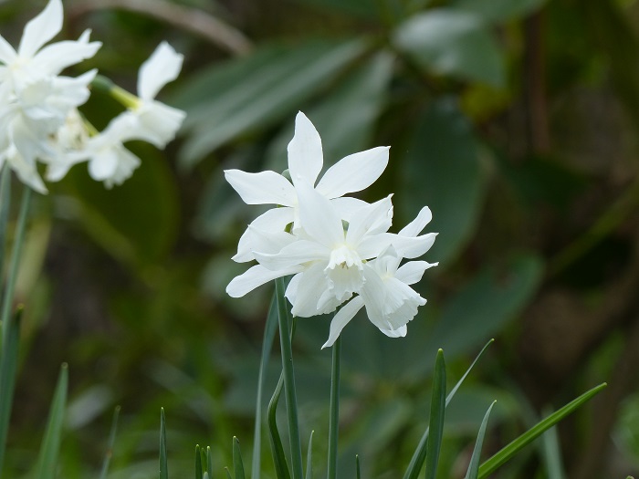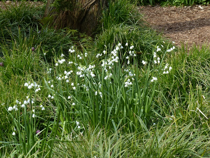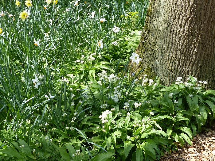 J'ai beaucoup apprécié cette scène pleine de charme au pied d'un vieux hêtre, associant deux petits bulbes d'exception : le Muscari 'Valérie Finnis' aux épis bleu porcelaine et l'Ipheion 'Alberto Castillo' aux fleurs étoilées blanches. Une idée facile à reproduire dans votre jardin !
