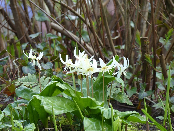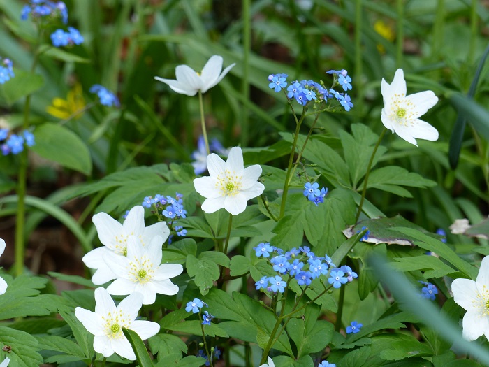 Après un coup d’œil à la célébrissime rivière de muscaris bleus que l'on retrouve sur toutes les cartes postales, Anne-Sophie m'a d'abord fait découvrir la partie la plus sauvage et naturelle du parc, dans une ambiance de sous-bois colorée par de nombreux petits bulbes naturalisés, comme les Anemone blanda, les Chionodoxa (Gloire-des-neiges), les fritillaires pintade ou meleagris, les Erythronium, l'ail des ours, et bien sûr les jonquilles et narcisses botaniques... mais aussi des variétés moins connues comme le Corydalis solida 'Beth Evans' accompagnés de quelques vivaces comme le myosotis du Caucase, sans oublier les irremplaçables anémones des bois blanches : celles-ci poussent en grands tapis de feuillage vert frais qui forme un écrin délicat pour les autres plantes.