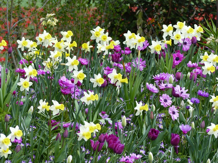 Cette association de couleur classique s'il en est, est tout particulièrement appréciée aux Pays-Bas où elle rappelle la célèbre porcelaine de Delft, ville située non loin du Keukenhof. Plusieurs bonnes idées étaient à prendre lors de notre visite en matières d'association de petits bulbes blanc/bleu : soit de la même espèce (anémones bleues et blanches), soit entre deux espèces (anémones et muscaris par exemple), de différentes hauteurs et précocités, mais toujours parfaitement synchronisés pour un effet optimal !