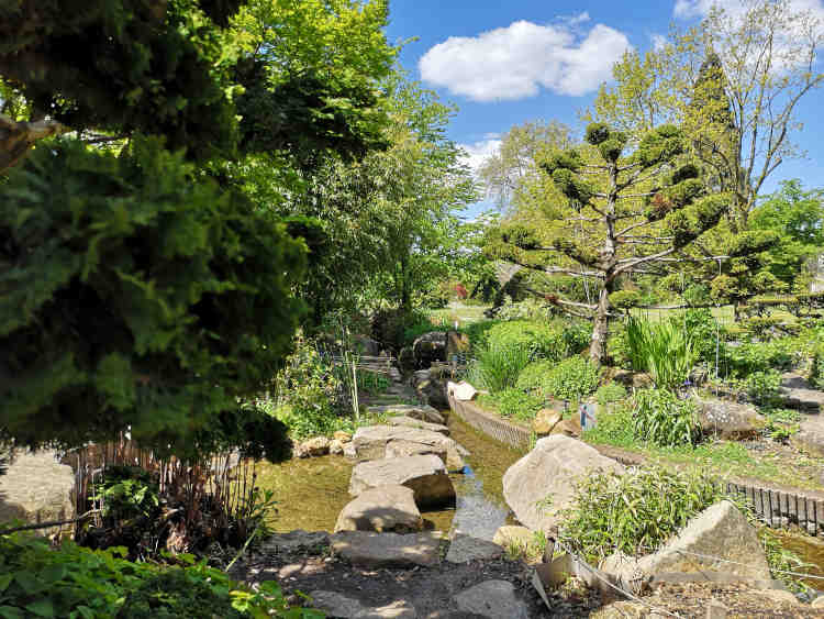 On termine la visite des jardins par l'espace dépaysant des rocailles. On déambule à l'ombre de résineux de toutes sortes, dans une ambiance fraîche de sous-bois parcouru par un ruisseau. Une profusion de plantes pousse aux pieds des arbres, entremêlant fougères, camassias, jacinthes et ails des bois. Les allées pavées donnent sur un petit jardin japonisant, où on enjambe des blocs de pierre placés dans l'eau. Une multitude de fleurs délicates se laisse admirer : fleurs jaunes de salsifis, mauves de géraniums sanguins, rouges d'arméries maritimes, bleues de bleuets, roses de saxifrages, blanches de cornus … Un petit pont japonais, une petite cascade, des bancs creusés dans des troncs invitent à se poser ici pour une parenthèse charmante.
